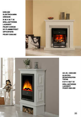6499.060 ELEKTROKAMIN OREGON B 99 H 95 T 36 BRILLANTWEISS LACKIERT FEUER CHROM 3D FLAMMEFFEKT OPTI-MYST® FEUER 2358.002 Art.-Nr.: 6504.060 ELEKTRO- SCANFIREOFEN TOPAS B 67 H 108 T 32 BRILLANTWEISS LACKIERT FEUER 2364.000 20