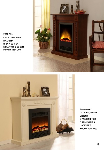 2592.020 ELEKTROKAMIN MODENA B 87 H 93 T 34 NB-ANTIK GEBEIZT FEUER 2364.000 6466.061A ELEKTROKAMIN VIENNA B 115 H 94 T 33 CREMEWEISS LACKIERT FEUER 2361.000 8