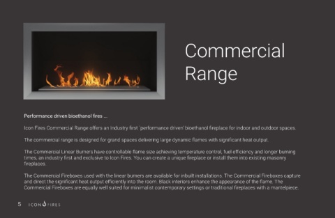 Icon Fires Commercial Range offers an Industry first `performance driven’ bioethanol fireplace for indoor and outdoor spaces.