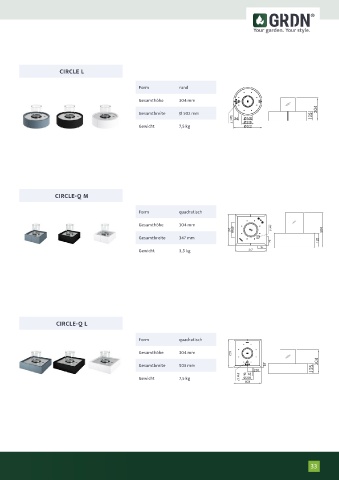CIRCLE L Form rund Gesamthöhe 304 mm Gesamtbreite Ø 502 mm Gewicht 7,5 kg CIRCLE-Q M Form quadratisch Gesamthöhe 304 mm Gesamtbreite 347 mm Gewicht 3,5 kg CIRCLE-Q L Form quadratisch Gesamthöhe 304 mm Gesamtbreite 503 mm Gewicht 7,5 kg 33