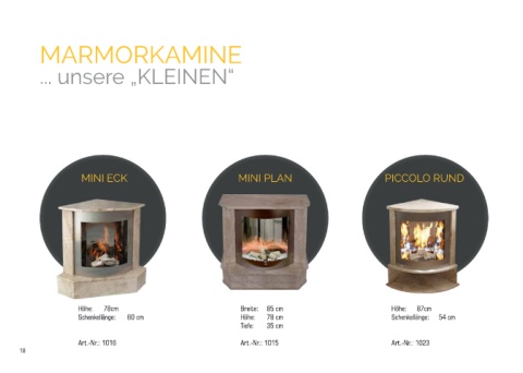 MARMORKAMINE ... unsere „KLEINEN“ MINI ECK MINI PLAN PICCOLO RUND Höhe: 78cm Breite: 85 cm Höhe: 87cm Schenkellänge: 60 cm Höhe: 78 cm Schenkellänge: 54 cm Tiefe: 35 cm Art.-Nr.: 1016 Art.-Nr.: 1015 Art.-Nr.: 1023 18