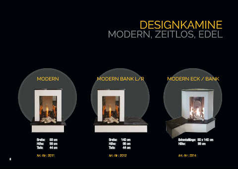 DESIGNKAMINE MODERN, ZEITLOS, EDEL MODERN MODERN BANK L/R MODERN ECK / BANK Breite: 88 cm Breite: 140 cm Schenkellänge: 80 x 140 cm Höhe: 96 cm Höhe: 96 cm Höhe: 96 cm Tiefe: 44 cm Tiefe: 44 cm Art.-Nr.: 2011 Art.-Nr.: 2012 Art.-Nr.: 2014 8